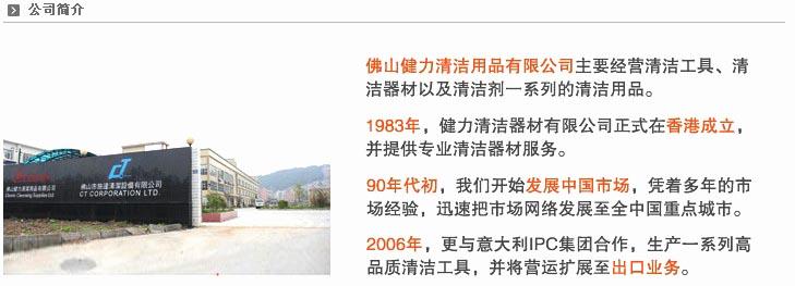佛山健力清洁用品有限公司公司于1983在香港成立,初时主要业务是提供清洁机械之维修保养及清洁技术顾问,并兼营机械销售,后凭着多年累积之市场及维修保养经验,直接引进欧美各地之专业产品及技术,而配套成为深受用户们信赖之健力清洁用品系列。 健力用品供应有限公司于1991年展开在中国国内之业务,总部设于广东佛山市,而分销网络已遍及各省主要城市。佛山总部除陈列室外,并设有仓库及维修中心,以支持各地分销业务需要,务求能提供高质之服务予使用客户。